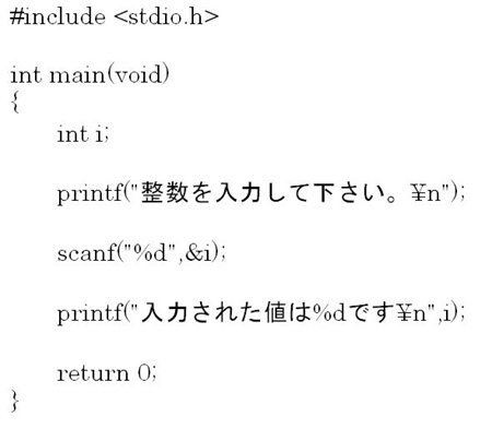 ⑤ そして今度はキーボードから入力した数値をprintf関数で出力するプログラムを作ります。