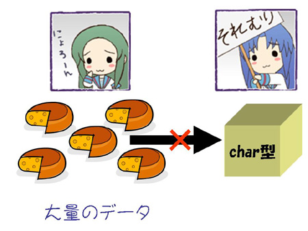 たとえば文字型であるchar型という変数が存在します。このchar型の変数に入れることができるデータは1バイトのみです。ですからchar型に1バイト以上のデータを入れることは不可能です。