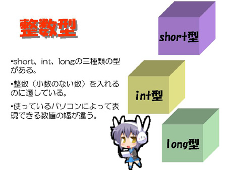 次に整数型。整数とは0、1、2、3・・・と足したり、逆に引いたりして表現することができる数のことです。short型、int型、long型と種類があり、それぞれ確保される領域のサイズが違います。(※short型が最も小さい領域で、long型が大きい領域。しかしパソコンによってはint型とlong型の確保できる領域は同じだったりもする)