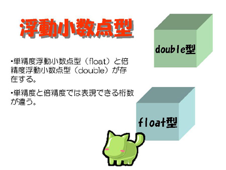 최후는 부동 소수점형입니다.C언어에서는, 이 형태를 사용하는 것에 의해서 소수 이하가 있는 수를 변수안에 넣을 수 있습니다.float형과 double형과 존재합니다만, float는 단정도, double형은 배정도로 불려 각각 표현할 수 있는 자리수가 다릅니다.