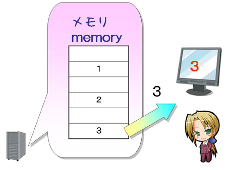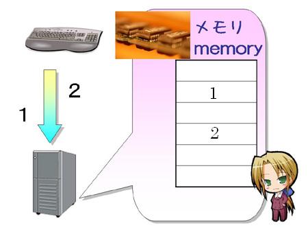 その数字はコンピュータの中のメモリ(主記憶装置)の一部分に、とりあえず記憶されます。