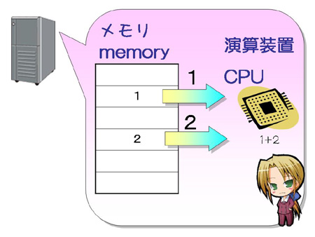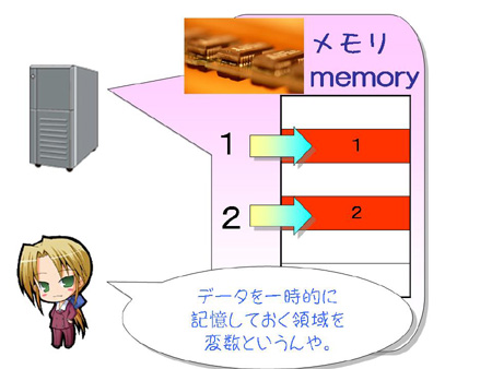なるほど。コンピュータで計算するためには、いったんメモリの中に数字を入れなくちゃいけないんですね。で、そのメモリの一部分が変数と・・・