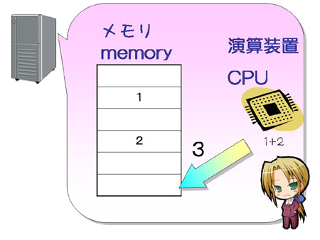 次にそのとりあえず記憶した場所から取り出し、コンピュータの演算装置(CPU)で計算します。