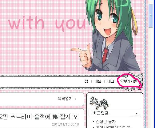 제 블로그의 방명록(아래 사진의 빨간 줄을 친 부분)에 글을 남겨주세요. 일본어로 남기셔도 됩니다.
