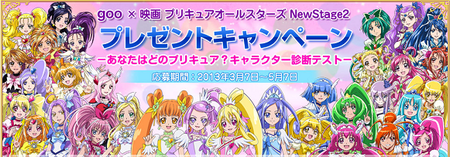 キャンペーンサイトでgooのデザインを「映画プリキュアオールスターズ NewStage2」版に設定すると診断テストが受けられる。休日の過ごし方など4つの質問に答えていくと、プリキュアシリーズにこれまで登場したすべてのプリキュアの中からどのタイプかが判定される。診断に参加するとプリートフォンドキドキプラスなどが当たるプレゼントキャンペーンに応募できる。