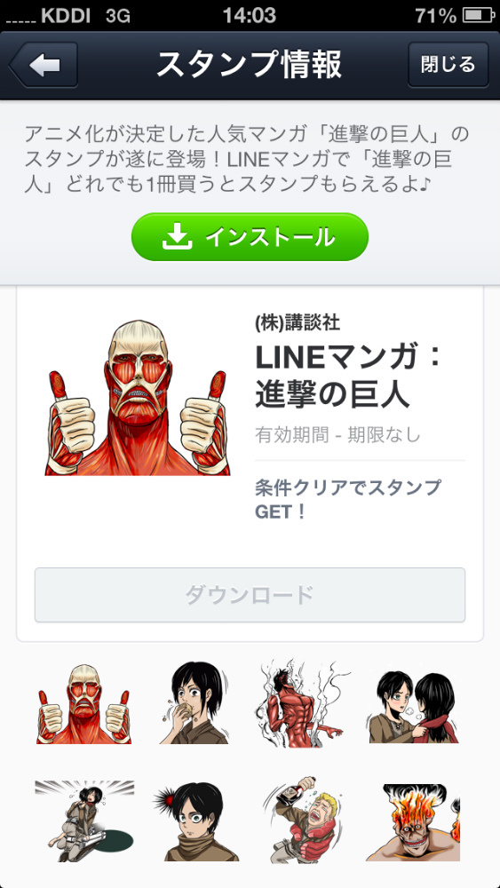 ▼スタンプをゲットするには、LINEマンガで『進撃の巨人』を1冊買わなければいけない。ここが唯一の難点……
