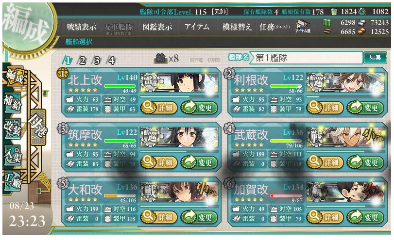 初戦惨敗もあり、北上戦4加賀のボス確kill編成にしたらボスマス行かず。