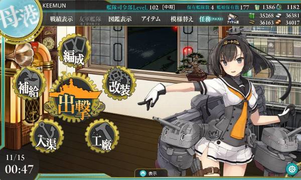 →방공 구축함 「슈우게츠」, 중순양함「Prinz Eugen」, 구축함 「조운?」가 니이미장 됩니다.「아키즈키」는「제2차혼작전」공략으로, 「Prinz Eugen」는「제3차」공략으로 입수 가능합니다.Extra Operation에서는 구축함 「야분」가 입수 가능합니다.