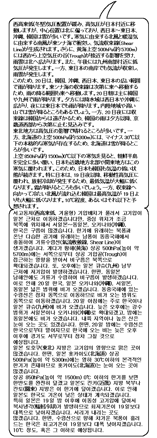 일본도 한국도 많은 지역에 차가운 비가 오겠습니다. 내륙지역은 눈이 오는 곳도 있겠습니다. 기온은 낮은 상태가 계속되겠습니다. 일본은 특히 아침 최저기온이 낮겠고 서리가 내리는 곳이 많겠습니다.