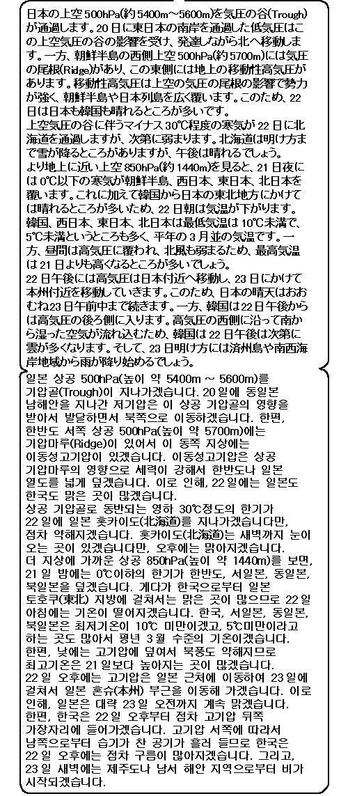 日本も韓国も昼間は今日よりも気温が上がります。ただし、朝は今日と同じぐらい、あるいはそれ以上に気温が低く、寒い朝になります。特に東日本の内陸地域では今日よりも5℃以上気温が下がります。内陸地域では最低気温は0℃程度、あるいはそれ以下になるところがあるでしょう。