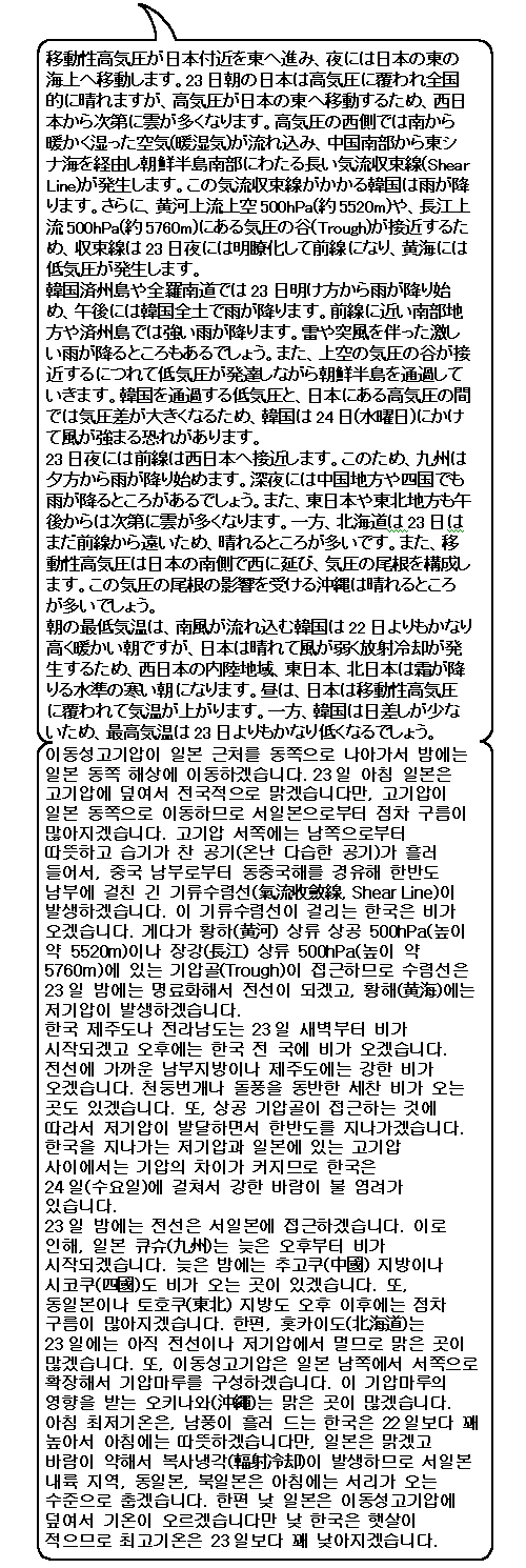 이동성 고기압이 일본 근처에 있는 한편 한국은 서쪽으로부터 접근하는 저기압이나 전선의 영향을 받겠습니다. 한국은 남부지방을 중심으로 본격적인 비가 오겠고, 천둥번개나 돌풍을 동반하는 곳도 있겠습니다. 또 강한 바람이 불 가능성도 있습니다. 일본은 낮에는 화창하겠습니다만 아침 최저기온이 낮겠습니다. 그리고, 내일 한국에 오는 비나 바람은 모레 한층 세차게 되면서 일본에 오겠습니다.