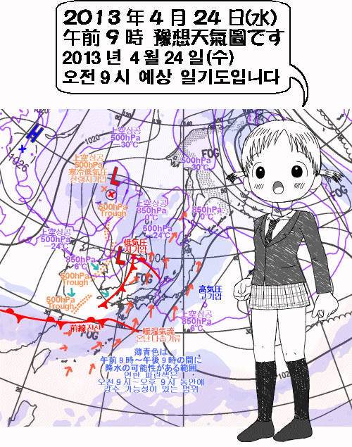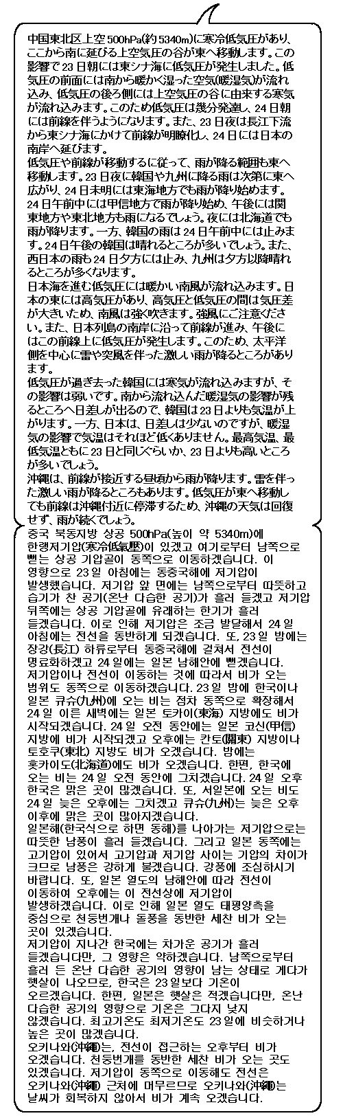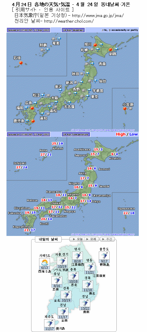 한국 날씨는 회복하겠습니다만 일본은 전국적으로 비가 오겠습니다. 서일본∼동일본 태평양측이나 오키나와(沖繩)는 천둥번개를 동반한 세찬 비가 오는 곳이 있겠습니다.