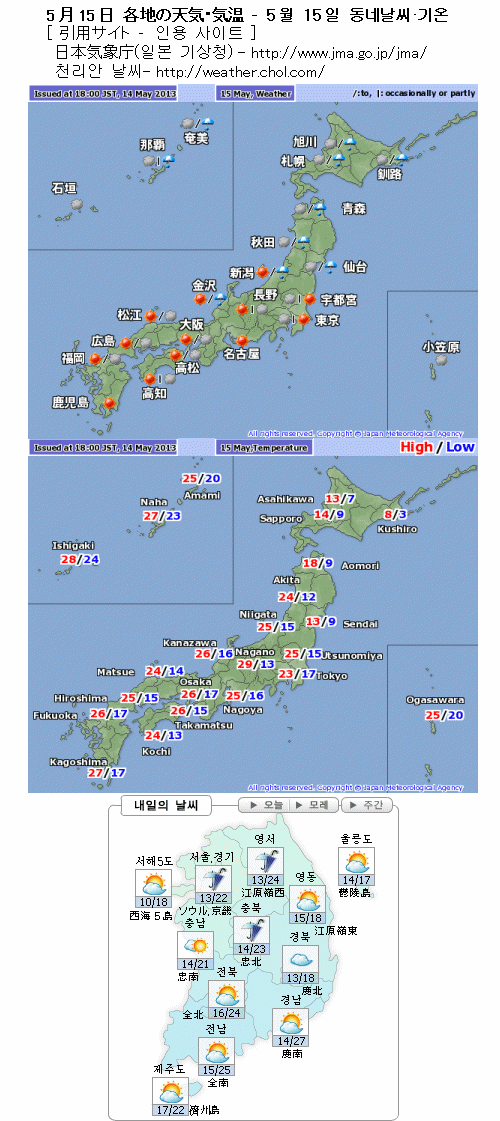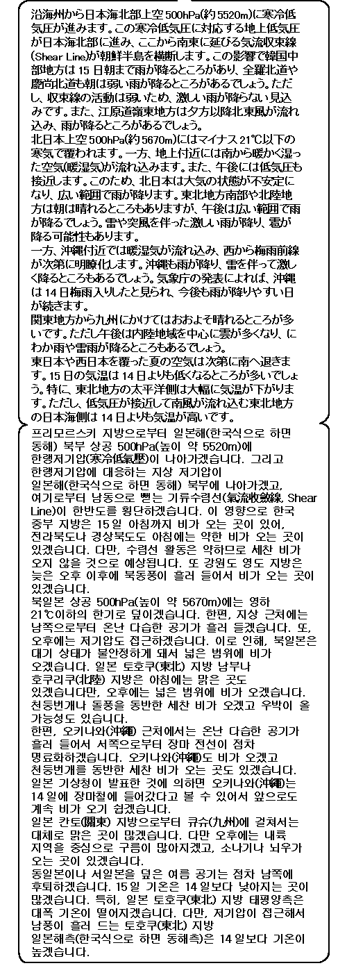 동일본, 서일본은 맑은 지역이 많겠습니다만 그 밖 지역은 구름이 많겠고 특히 한기로 덮이겠고 저기압이 접근하는 북일본이나 장마철이 시작된 오키나와(沖繩)는 세찬 비가 오기 쉽겠습니다.