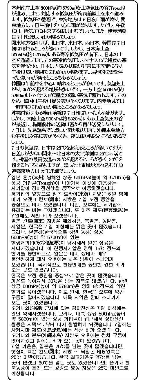 일본 토호쿠(東北) 지방으로부터 큐슈(九州)에 걸쳐서 오래만에 넓은 범위에 비가 오겠어요. 다만 이 비가 오는 것은 내일 뿐이겠습니다. 모레 이후에는 다시 개겠고 더위가 돌아오겠어요. 한국은 맑은 지역이 많겠지만 오후에는 내륙 지역을 중심으로 한때 소나기가 오는 곳이 있겠어요.