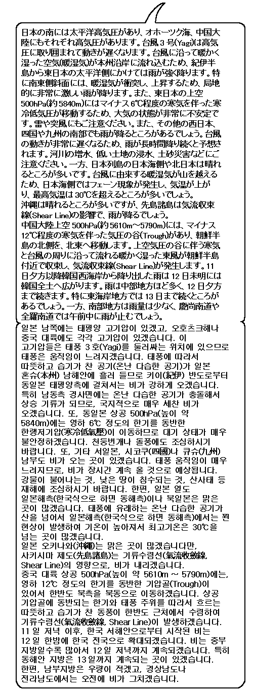 태풍은 점차 세력이 쇠약해지겠습니다만, 큰 비를 가져오는 능력은 유지되겠습니다. 게다가 움직임이 매우 느리므로 비가 긴 시간 오겠습니다. 앞으로도 계속 조심하시기 바랍니다. 한편, 한국은 기류수렴선의 영향으로 비가 오는 곳이 많겠습니다.