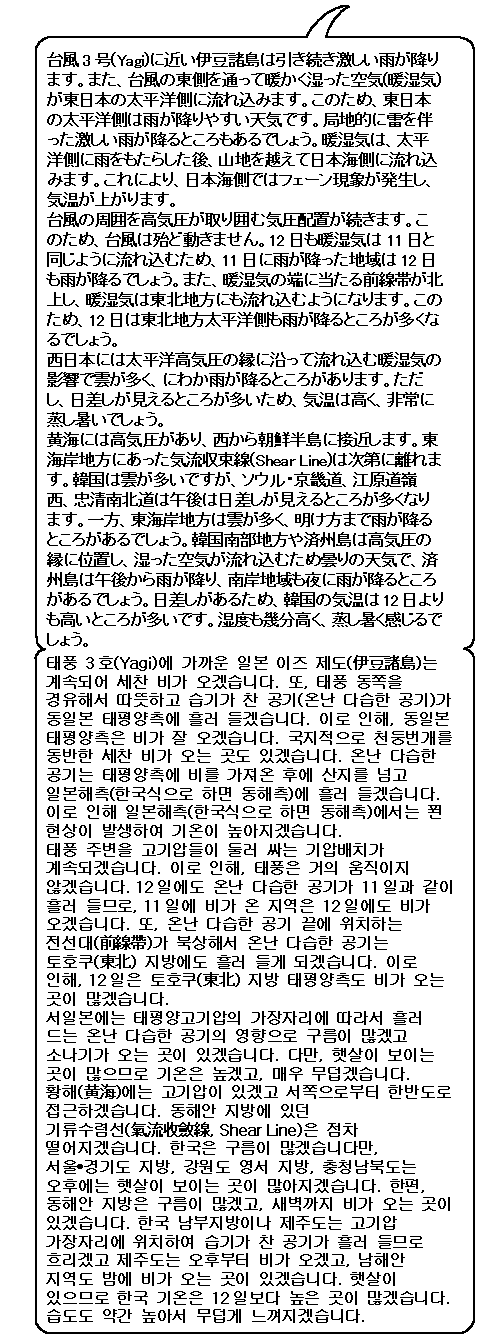 태풍이나 태평양 고기압에 유래하는 따뜻하고 습기가 찬 공기(온난 다습한 공기)가 활발하게 흘러들겠습니다. 한국 남부, 서일본, 동일본 태평양측, 북일본 태평양측은 온난 다습한 공기의 영향으로 구름이 많겠고 비가 내리기 쉽겠습니다. 특히 일본 칸토(關東) 지방 주변은 세찬 비가 올 염려가 있습니다. 한편, 일본 열도 일본해측(한국식으로 하면 동해측)은 내일도 푄 현상이 발생해 기온이 매우 높겠습니다.