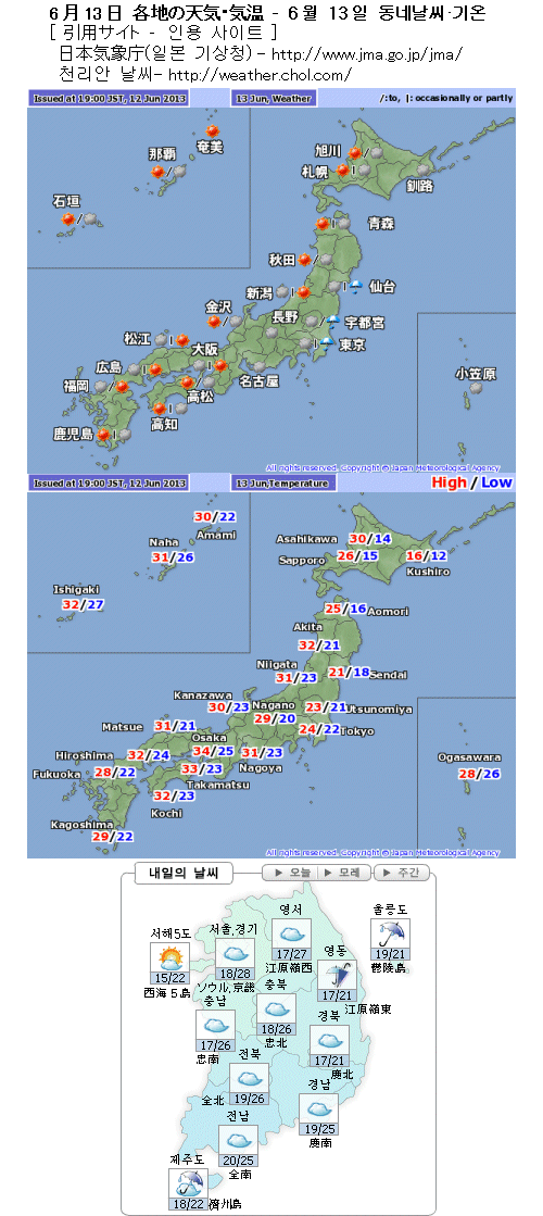 태풍이나 태평양 고기압에 유래하는 따뜻하고 습기가 찬 공기(온난 다습한 공기)가 활발하게 흘러들겠습니다. 한국 남부, 서일본, 동일본 태평양측, 북일본  태평양측은 온난 다습한 공기의 영향으로 구름이 많겠고 비가 내리기 쉽겠습니다. 특히 일본 칸토(關東) 지방 주변은 세찬 비가 올 염려가 있습니다. 한편, 일본 열도 일본해측(한국식으로 하면 동해측)은 내일도 푄 현상이 발생해 기온이 매우 높겠습니다.