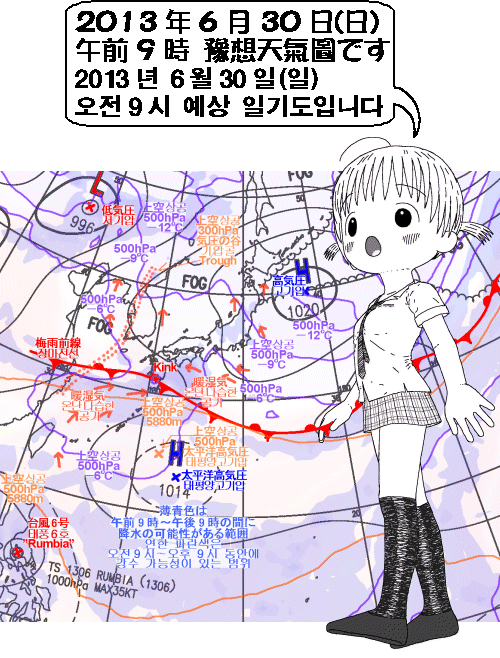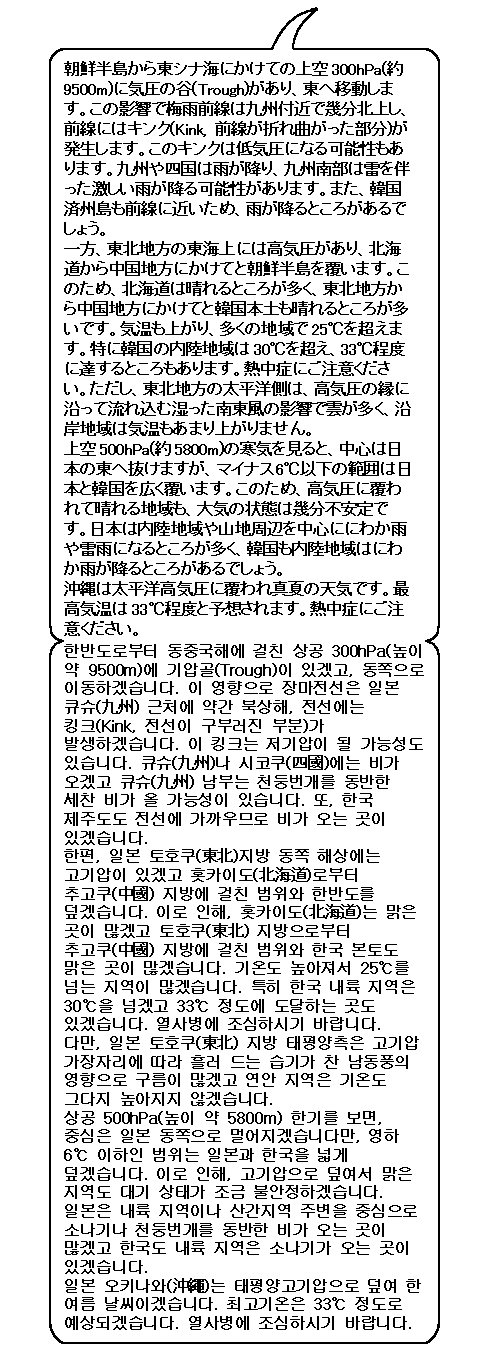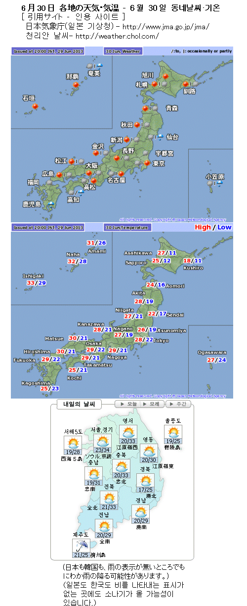 내일은 일본 큐슈(九州)나 시코쿠(四國)에 비가 오겠고, 특히 큐슈(九州) 남부에는 세찬 비가 오겠어요. 이 비는 장마전선에 유래하겠습니다. 그 밖 지역은 햇살이 보이는 곳이 많겠지만요 상공에 한기가 존재하므로 오후에는 대기 상태가 불안정하게 돼서 소나기가 오는 곳이 있겠습니다.