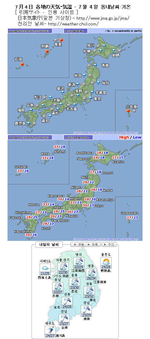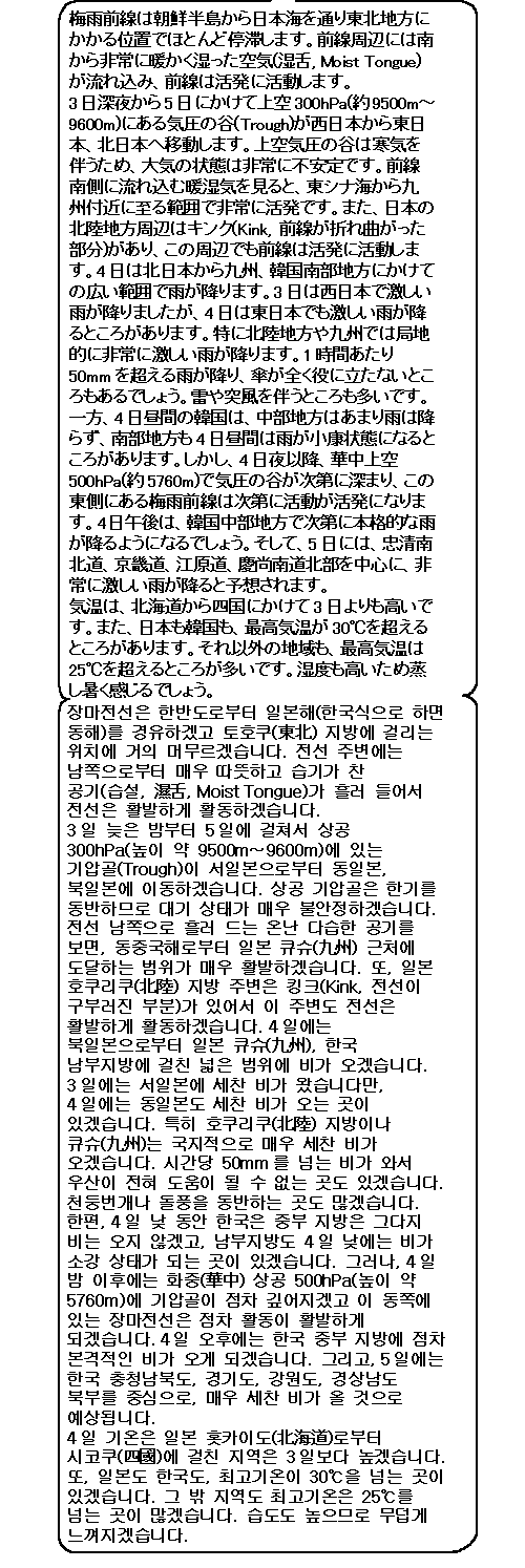 일본은 동일본으로부터 서일본에 걸친 넓은 범위에 비가 오겠고 천둥번개나 돌풍을 동반하면서 세차게 오는 곳이 있겠습니다. 한국도 남부지방을 중심으로 비가 오겠습니다만, 조금 약한 비이겠습니다. 다만 내일 밤 이후에는 한국 중부지방을 중심으로 비가 점차 세차게 오게 되겠습니다. 일본 근처는 등압선 간격이 좁아서 고온 다습한 남풍이 강하게 불겠습니다.