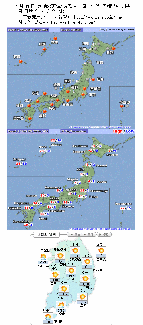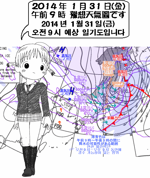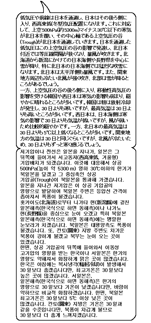 북일본은 폭풍설. 토쿄(東京) 주변도 바람이 강하겠어요. 한편 나고야(名古屋)나 그곳보다 서쪽, 그리고 한국은 대략 화창하게 개겠습니다.