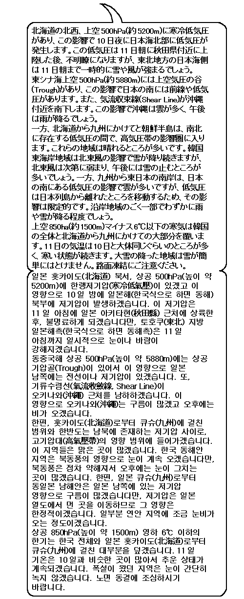 내일은 일본도 한국도 비교적” 평화로운” 날씨. 한국 동해안에 오는 폭설도 그치겠습니다. 다만 기온은 낮은 상태가 계속돼 도시 도로는 점차 스케이트장적인 상태로 변화해 갑니다.