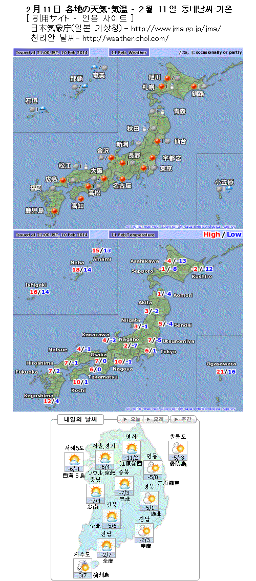 내일은 일본도 한국도 비교적" 평화로운" 날씨. 한국 동해안에 오는 폭설도 그치겠습니다. 다만 기온은 낮은 상태가 계속돼 도시 도로는 점차 스케이트장적인 상태로 변화해 갑니다.