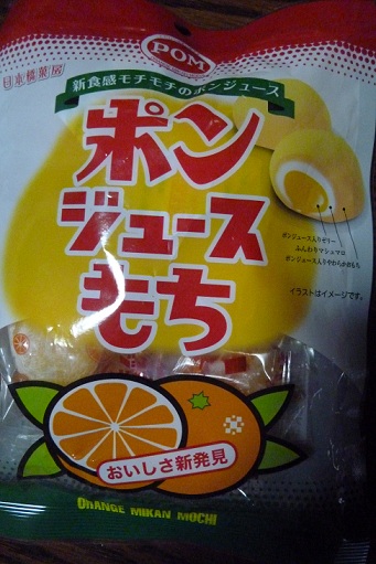ポンジュースゼリーをマシュマロで包んだものを、更にお餅で包んであります。