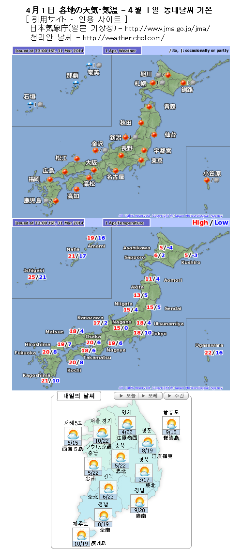 홋카이도와 오키나와를 제외하면 대략 날씨가 좋겠어요. 기온 일교차가 크니까 조심하세요.