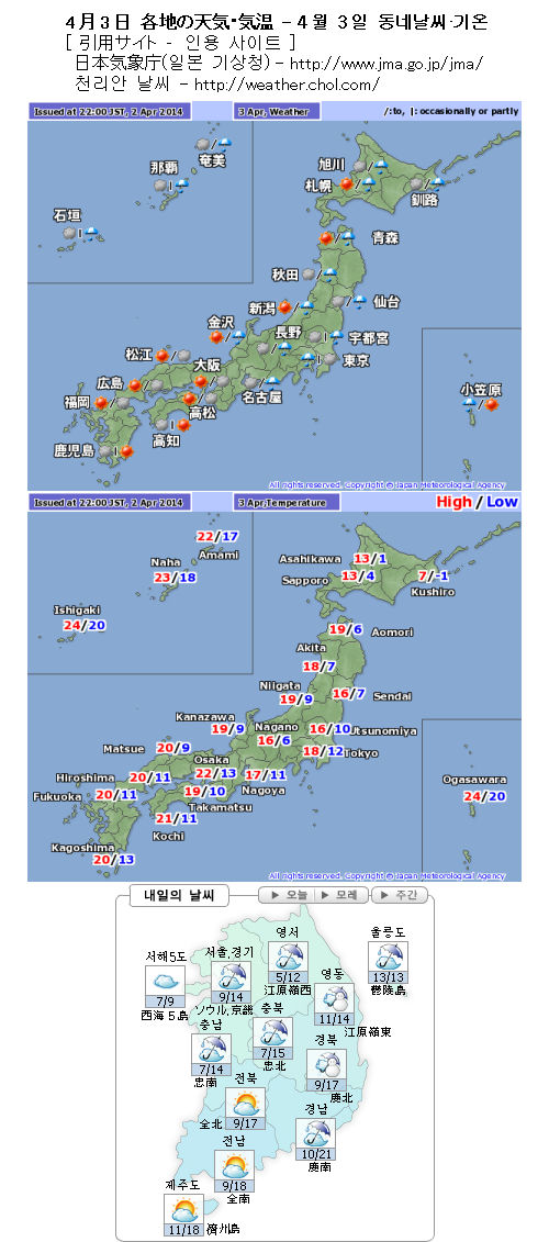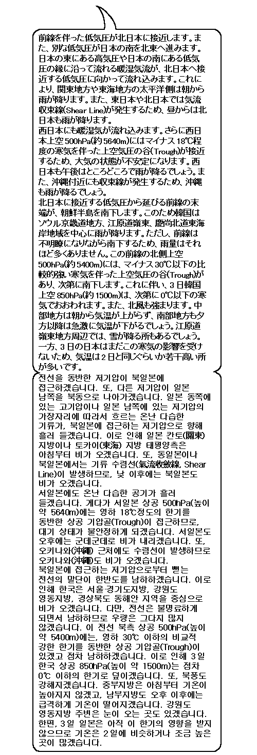 明日は雨の降る所が多いです。韓国は気温が急激に下がります。
