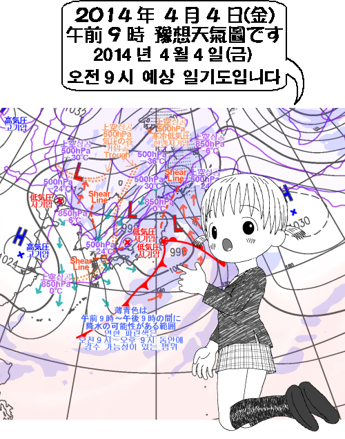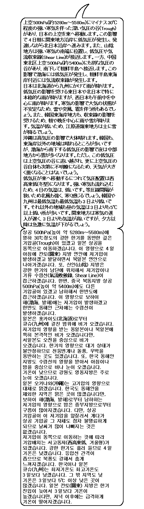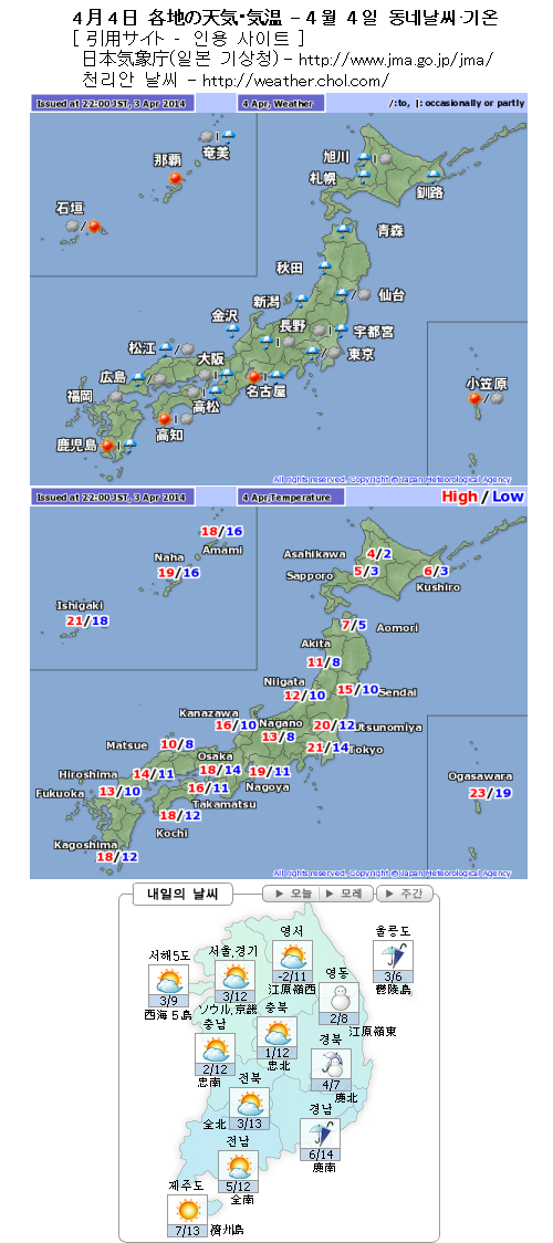 북일본∼큐슈(九州)와 한국 동해안지방은 비. 특히 강원도영동지방은 눈이 오겠습니다. 기온은 일본 칸토(關東) 지방을 제외해 낮아서 춥겠습니다.