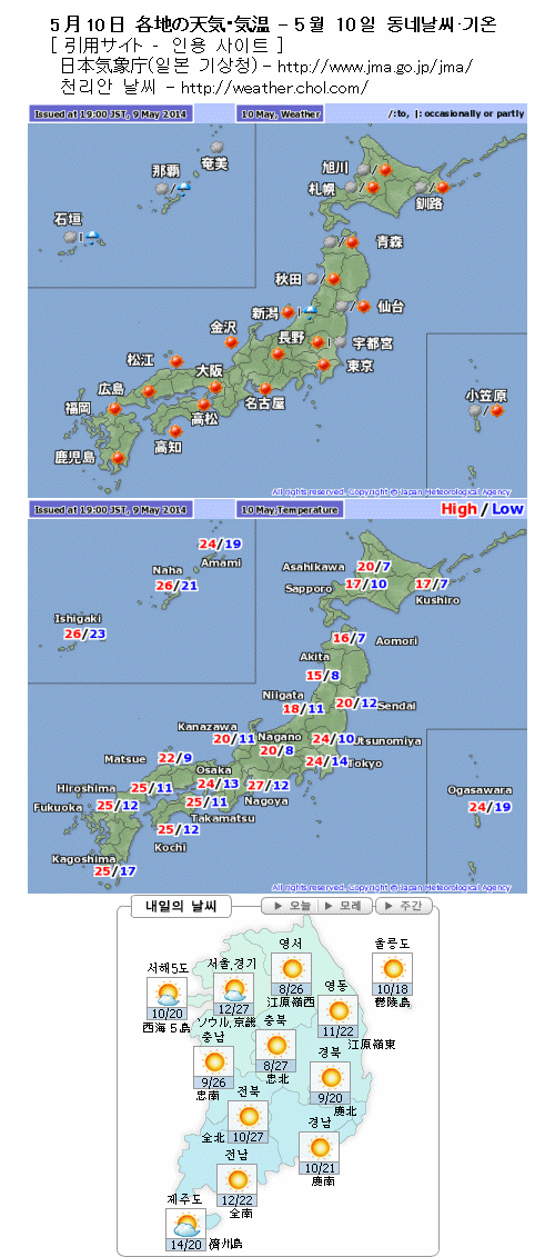 明日は日本も韓国も晴れるところが多いです。ただし明後日は韓国は雨が降る可能性が高いです。