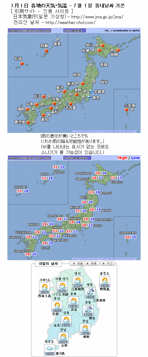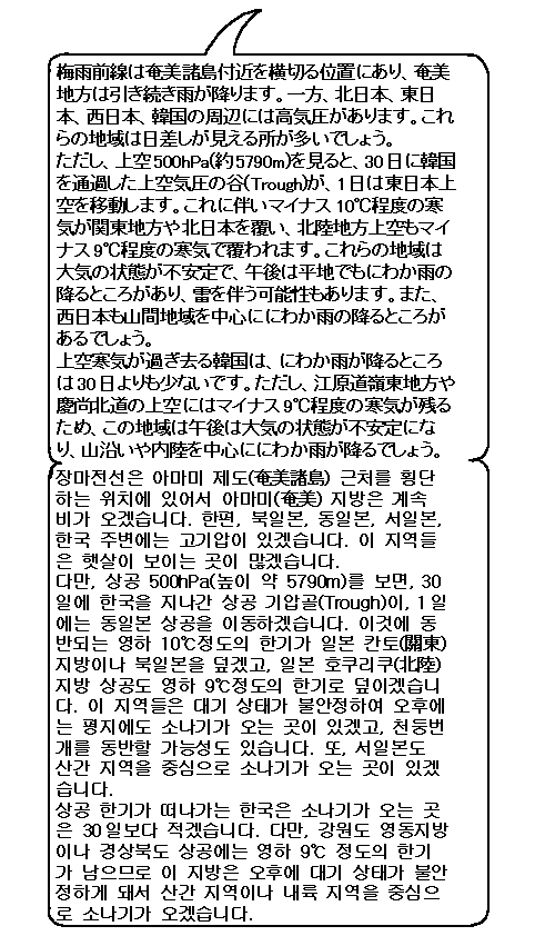 일본이나 한국 동해안 상공에는 한기가 존재하므로 이 지역들은 소나기가 오는 곳이 있겠습니다.