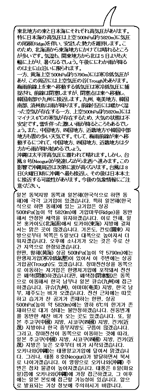 장마전선의 영향으로 서일본이나 한국 남부는 비가 오겠습니다. 세찬 비가 오는 곳도 있을 거 같습니다.