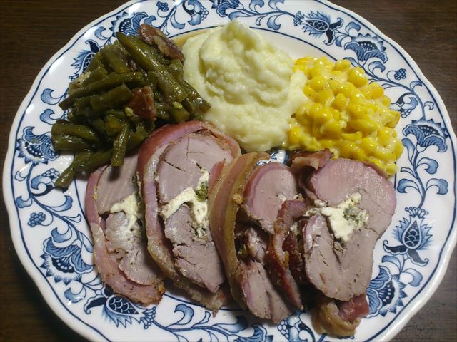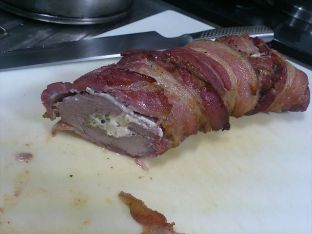 いつかも作った豚のヒレ肉の中にクリームチーズとハラペーニョ唐辛子のピクルスを入れてベーコンで巻いた物