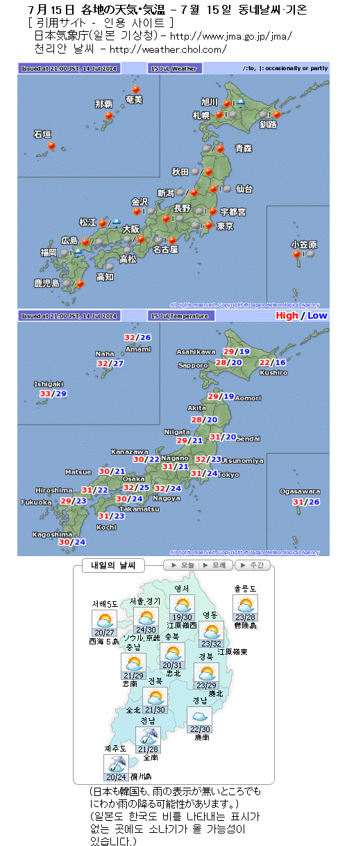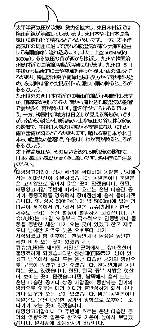 일본도 한국도 찜통더위. 서일본이나 한국 남부·제주도는 호우에도 조심하세요.