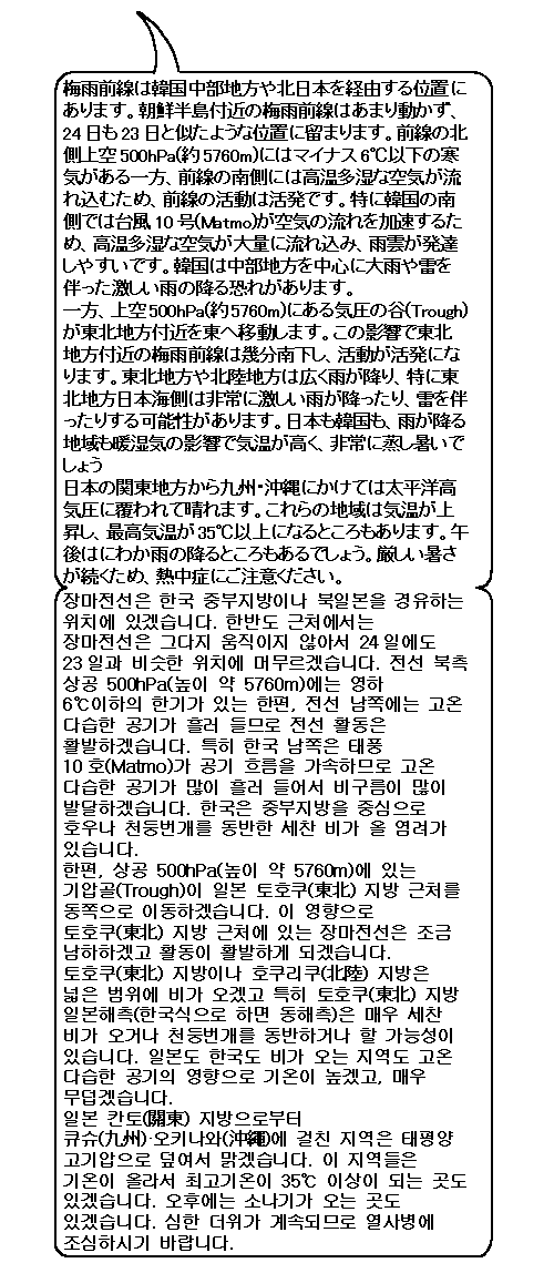 일본 칸토(關東)지방으로부터 서쪽은 폭염이 계속되겠습니다. 한편 일본 토호쿠(東北) 지방 일본해측(한국식으로 하면 동해측)이나 한국은 장마전선의 영향으로 호우가 올 염려가 있습니다.