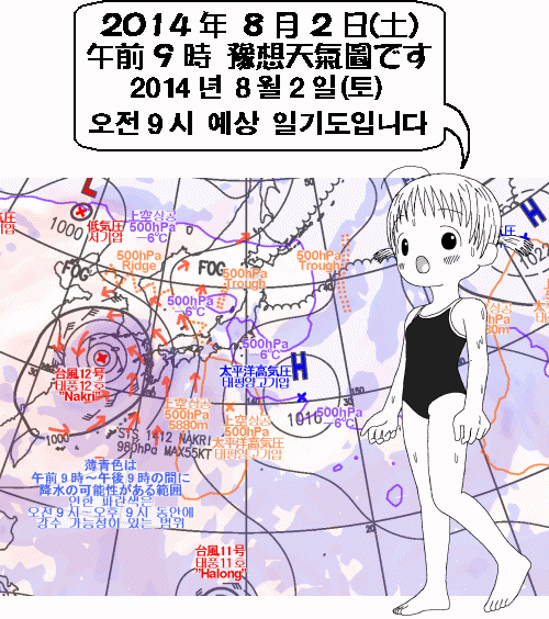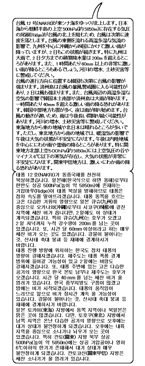 큐슈(九州), 시코쿠(四國), 오키나와(沖繩), 한국남부에다가 내일은 한국중부지방도 태풍의 영향을 받기 시작하겠습니다.