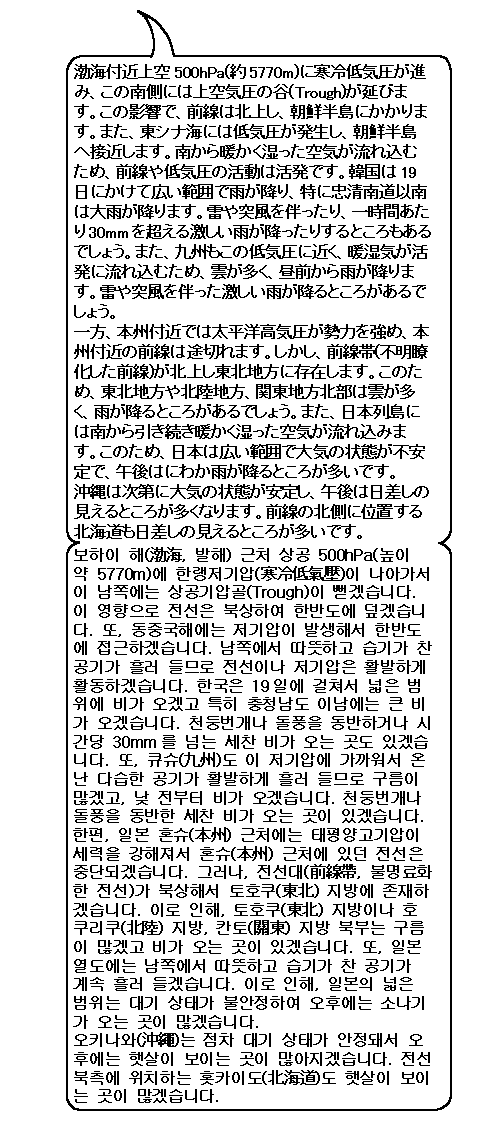 큰비가 오는 범위는 한국 남부에서 일본 큐슈(九州) 북부에 이동하겠습니다. 또 홋카이도(北海道) 주변도 세찬 비가 오겠습니다.