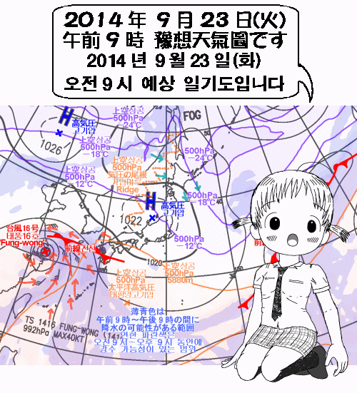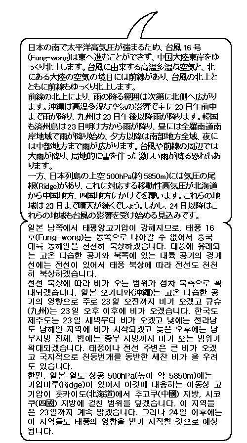 일본 큐슈(九州), 오키나와(沖繩)는 태풍이나 전선의 영향으로 비다 오겠고 한국도 제주도나 남부지방으로부터 점차 비가 확대되겠습니다. 큰비나 세찬 비에 조심하시기 바랍니다.