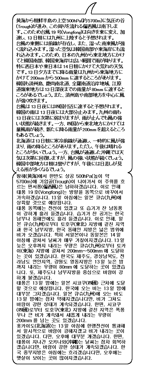 앞으로 2일간, 일본 큐슈(九州)∼토호쿠(東北) 지방에 걸친 넓은 범위가 태풍의 영향을 받겠습니다. 또 한국도 바람이 강하겠고 남부지방이나 동해안지방을 중심으로 비가 오겠습니다.