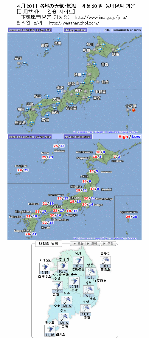 일본도 한국도 대략 전국에 비가 오겠습니다. 특히 일본 태평양측에는 매우 세찬 비가 올 염려가 있습니다. 한편 한국에 오는 비는 밤에 그치는 곳이 많겠습니다.