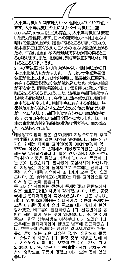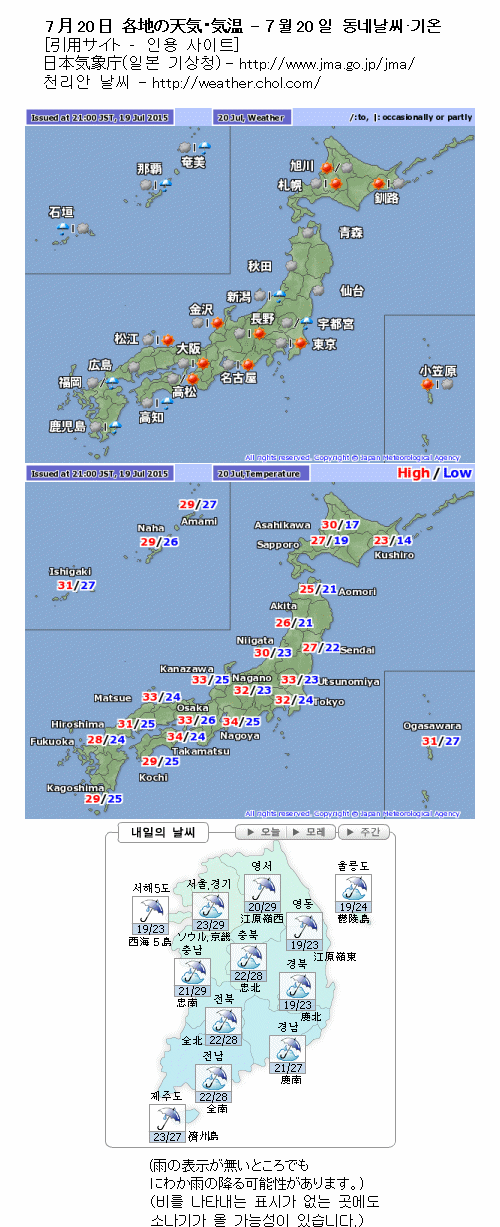 일본 기상청은 일본 칸토코신(關東甲信)지방의 장마철이 끝난 것으로 보인다고 발표했습니다. 이 지역 주변은 내일도 너무 덥겠습니다. 한편 열대저기압에 가까운 큐슈(九州), 오키나와(沖繩)는 세찬 비가 오겠고 한국도 전국에 비가 오겠습니다.