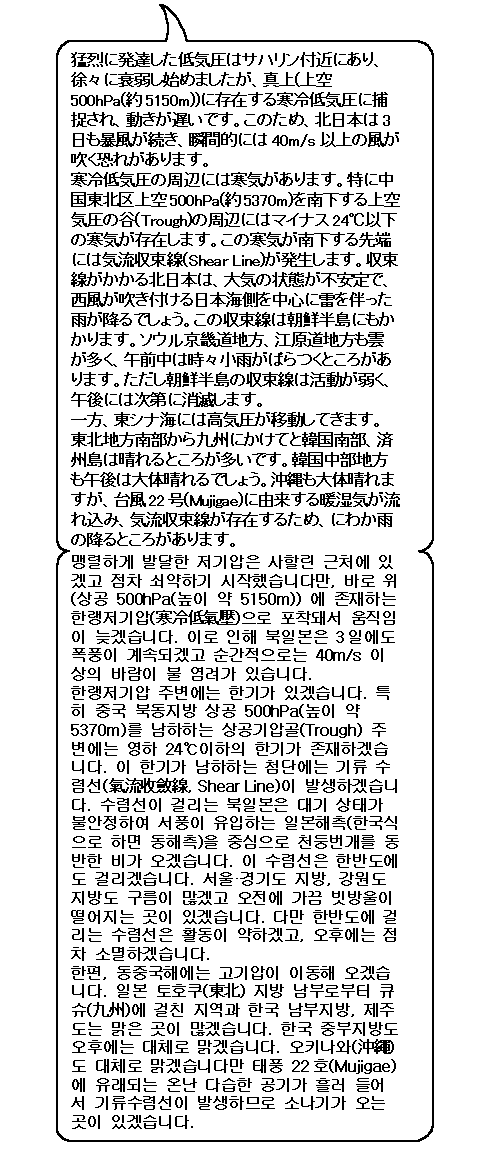 북일본은 폭풍이 계속되겠습니다. 그 밖 지역은 날씨가 좋겠습니다만 기온 일교차가 크겠습니다.