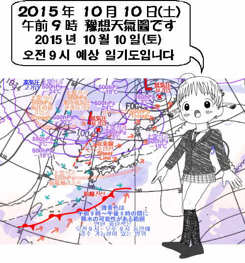 収束線が通過する韓国は雨の降るところが多いです。日本は晴れるところが多いですが、夜は次第に雲が多くなり、雨が降り始めるところもあるでしょう。