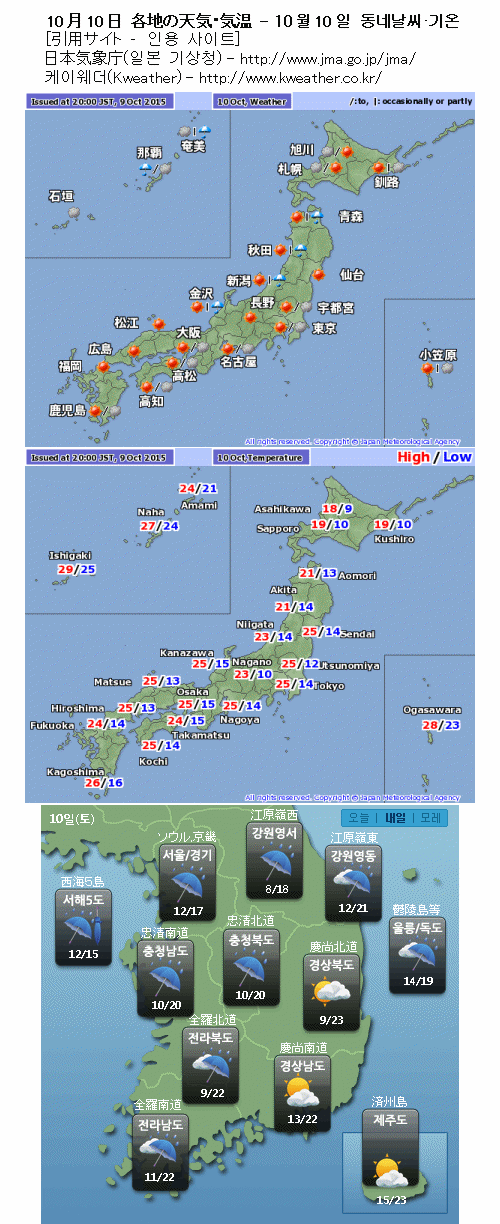 수렴선이 지나가는 한국은 비가 오는 곳이 많겠습니다. 일본은 맑은 곳이 많겠습니다만 밤에는 점차 구름이 많아지겠고 비가 시작되는 곳도 있겠습니다.