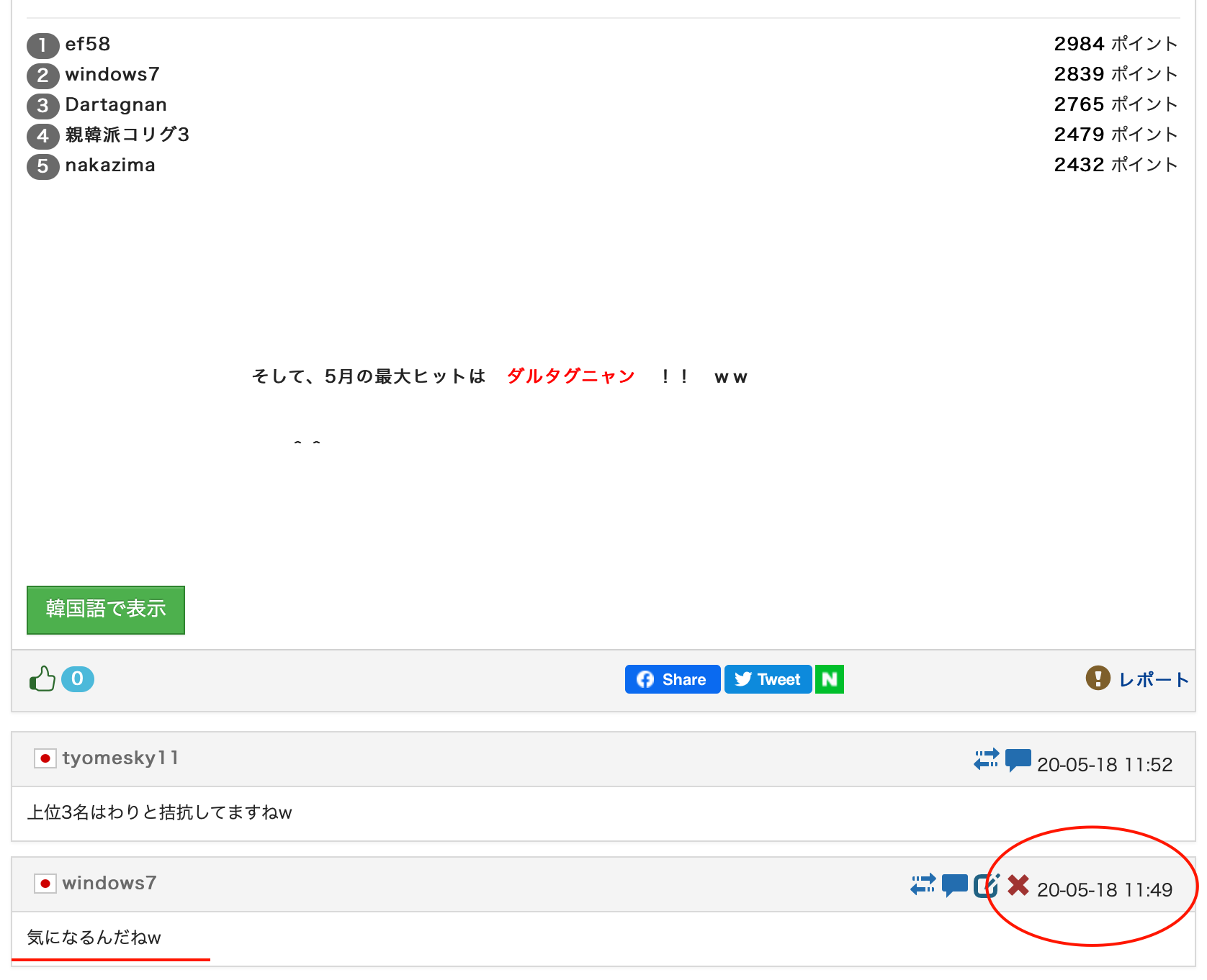 昨夜の廃人ランキング (親韓派とその手下が廃人をほぼ独占w)