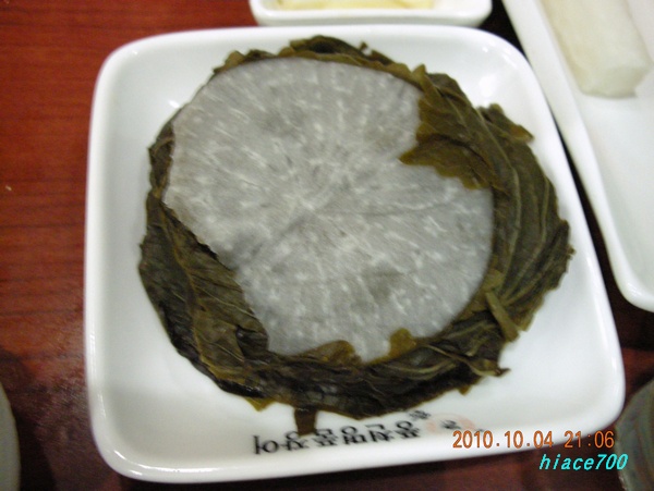 들깨의 잎에 무를 사이에 두어 있다.새콤달콤해서 좋은 맛