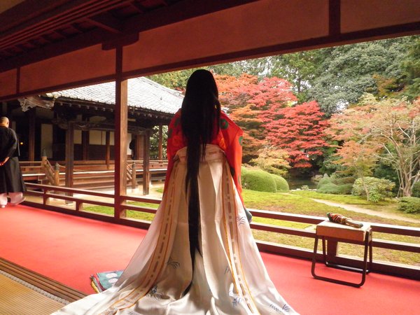 十二単を着た女性と、紅葉。