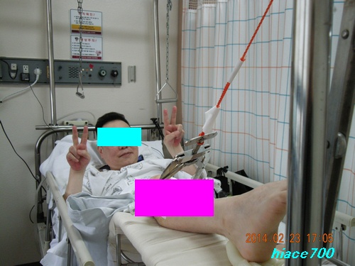 수술전에 다리를 견인중