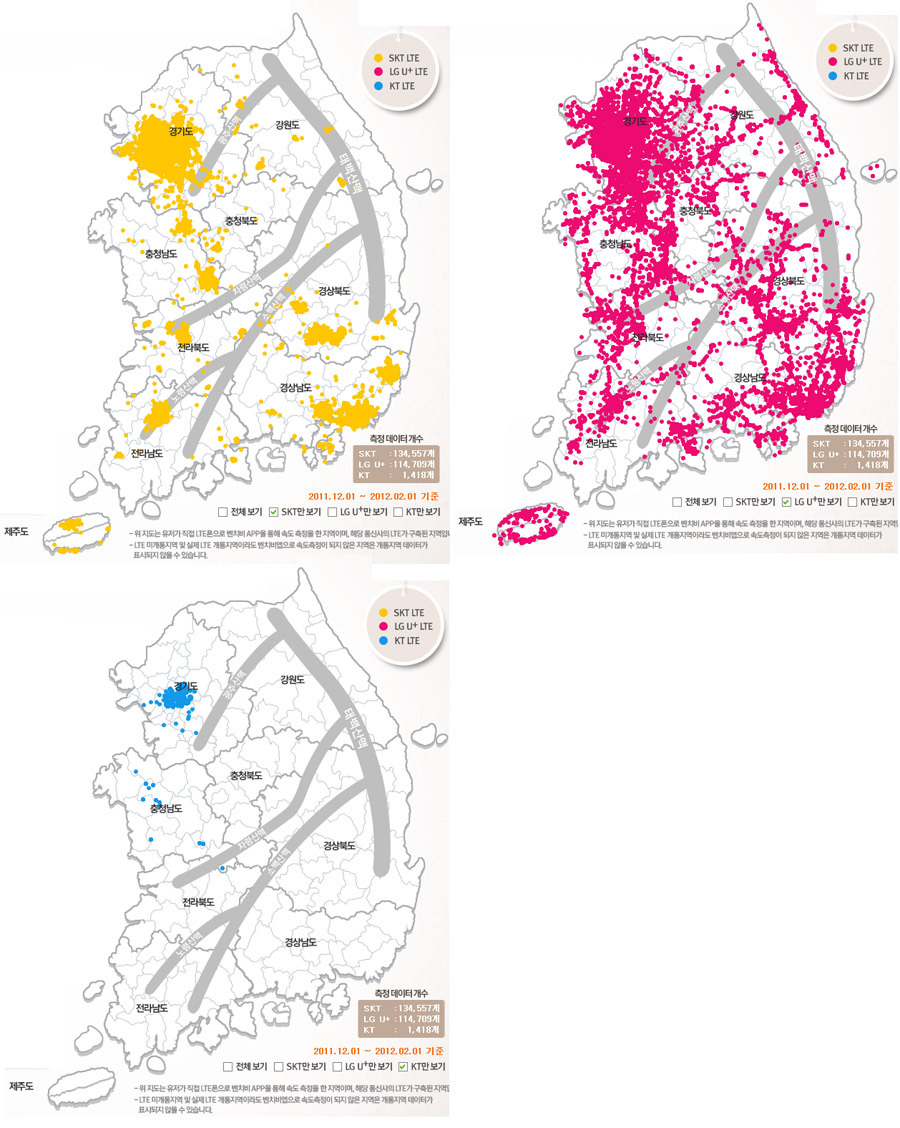 測定データは SKTが 13万 4千個で一番多いがソウルと首都圏, 広域市主としてカバーされています. LGU+は 11万 4千個のデータが収集されたし鬱陵島を含んで全国にすべて等しく分布しています.